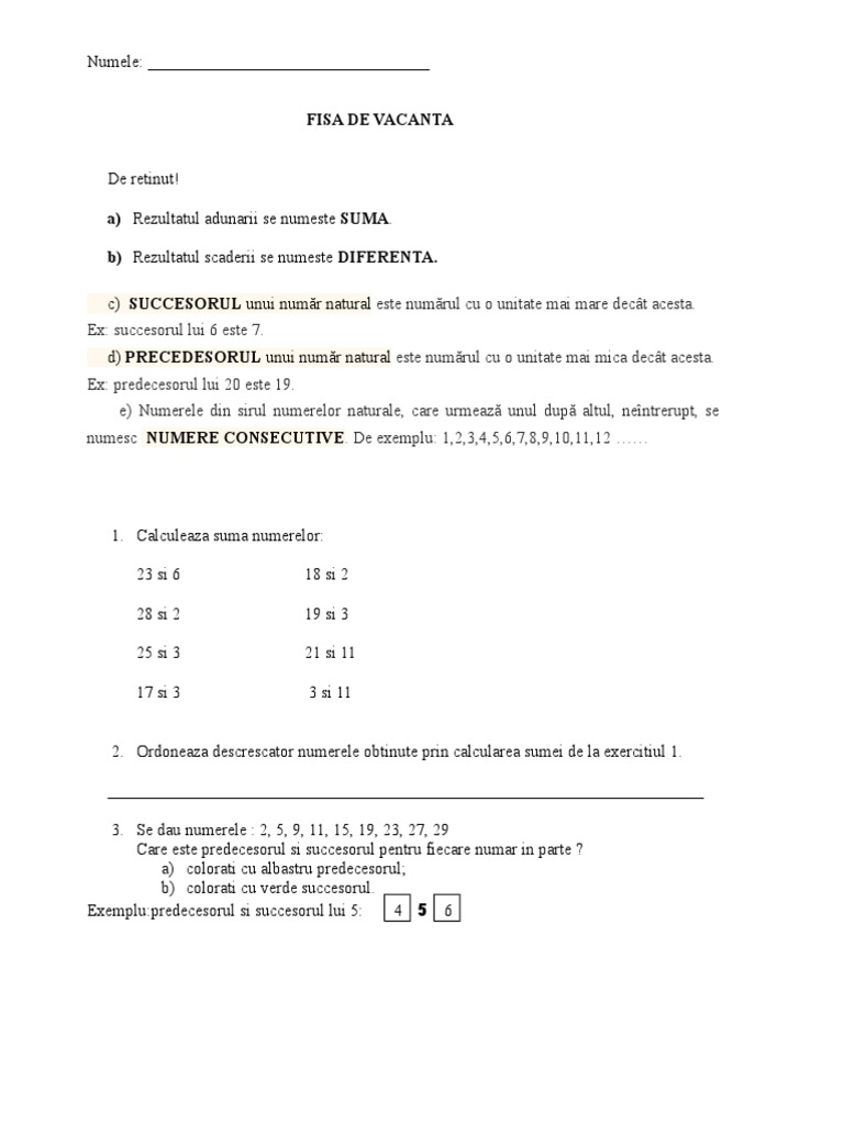 Fisa Vacanta Matematica Clasa I